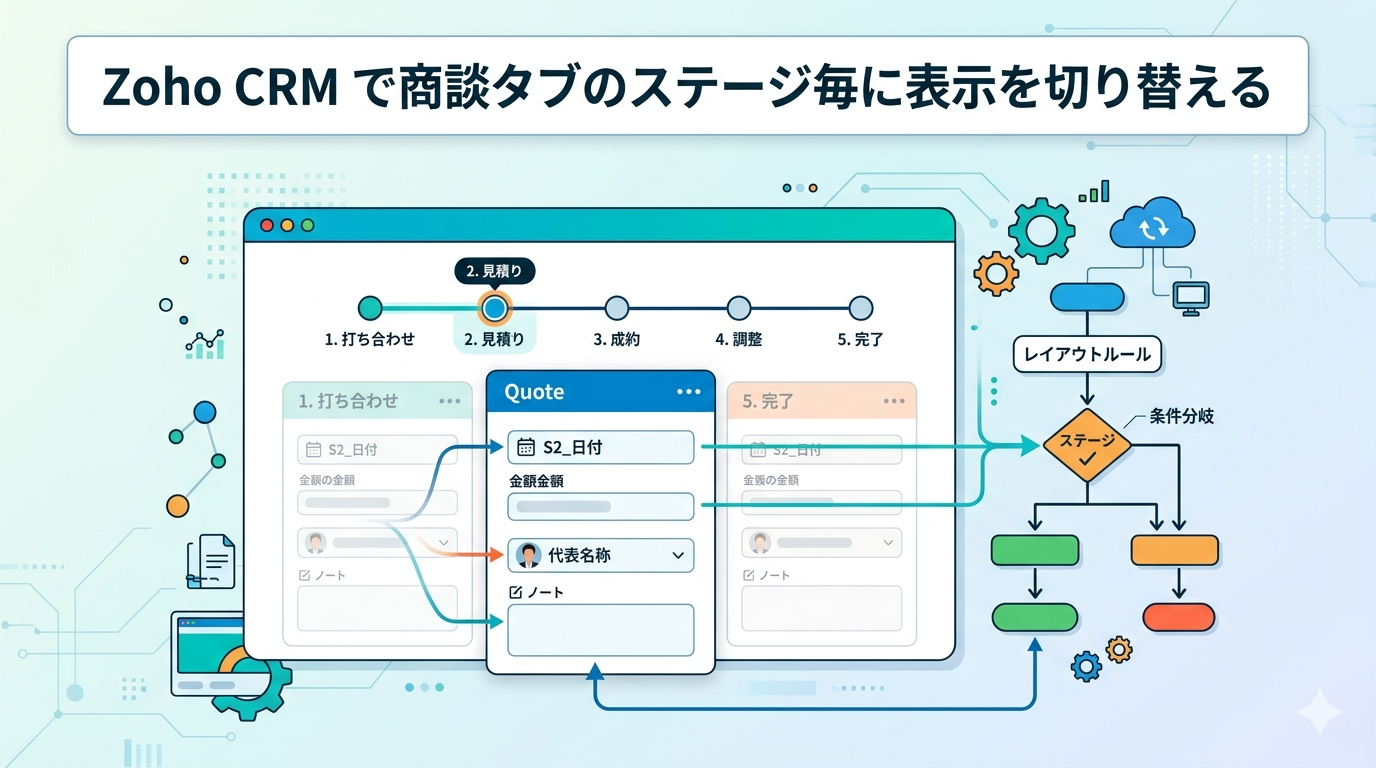 本日はクライアント様より、Zoho CRMの商談モジュールで現在のステージ毎に表示が切り替わるカスタマイズを承りました。