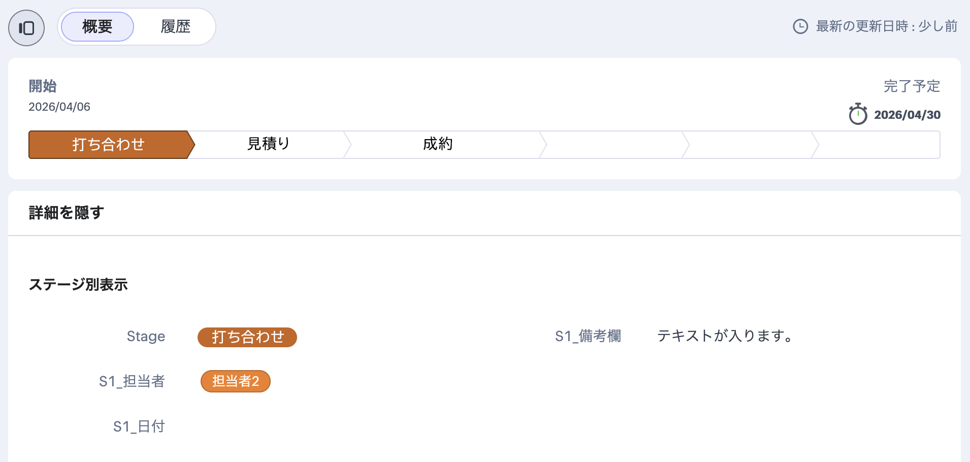 商談モジュールの詳細画面で表示されるパイプライン画面に、ステージ毎に担当者の名前や日付、メモ欄を分けて表示させたい場合。